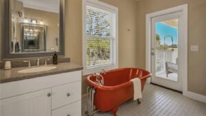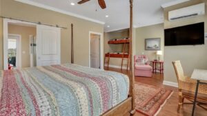 Each of the guest rooms has direct access to elevated, wrap-around decks, which offer spectacular, elevated waterfront views, private in-room seating areas, and luxurious en-suite bathrooms. Two dining areas, a large living room/entertainment center, and an open kitchenette complete the indoor common areas…and outside, even more decks, a dock, patio grill, a dock for water-toy access, and a fire pit area on the point make this inn a destination unto itself, even without being within view of the Sapelo Island ferry.