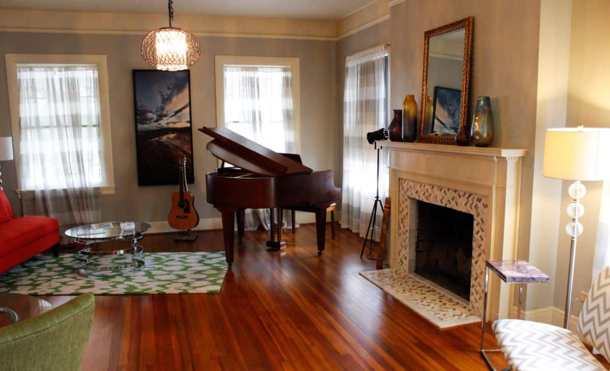 Common Areas: Includes dining and gathering rooms with a baby grand piano and original built-in cabinets stocked with games and library materials.